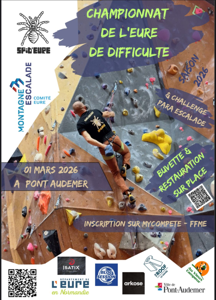 Le 1er mars 2026, le Spideur organise le championnat de l’Eure de difficulté (catégorie U15 à Vétéran). La journée se déroulera à la salle Diagana.